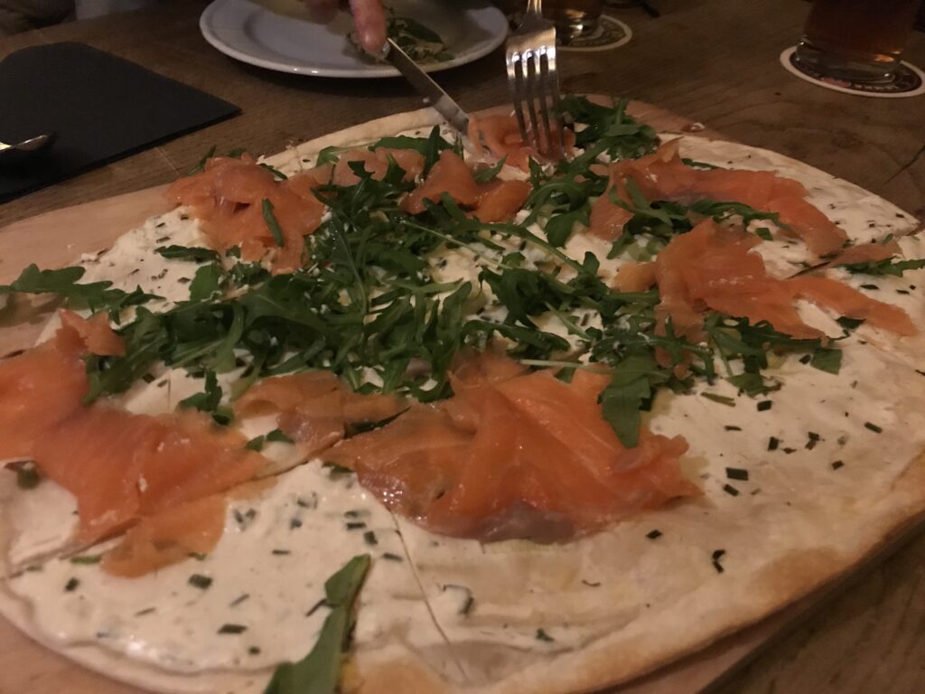 お食事はドイツの薄焼きピザ、フラムクーヘン。私これ大好きでした。