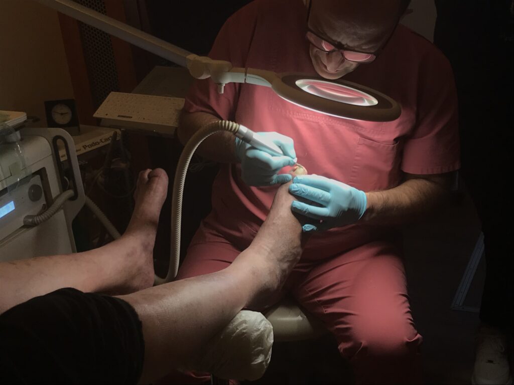 この患者さんは、糖尿病により末梢神経障害を併発していて、すでに足先にほとんど感覚がないと言われていました。熱い痛いがわからないばかりか、このまま放っておくと足が壊死してしまうため、定期的なフットケア・治療が必要とのことでした。