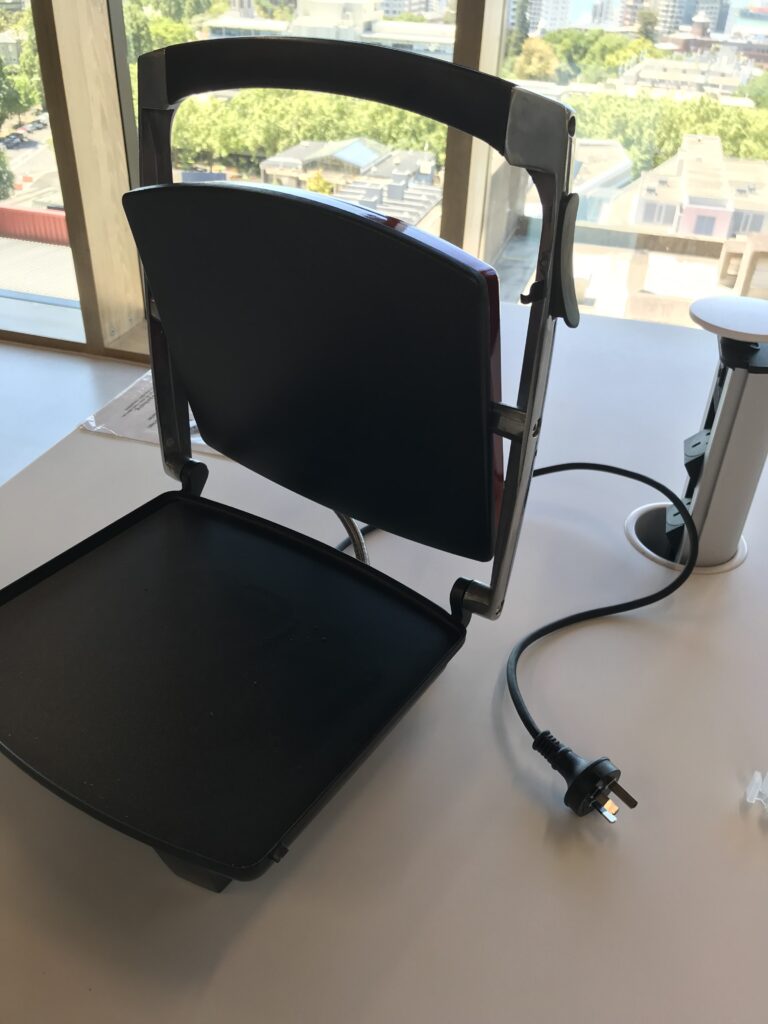 私がこの隣のシンクでお弁当箱を洗っていると、アイルランド人がサンドイッチを作りにきて、このマシンでプレス。